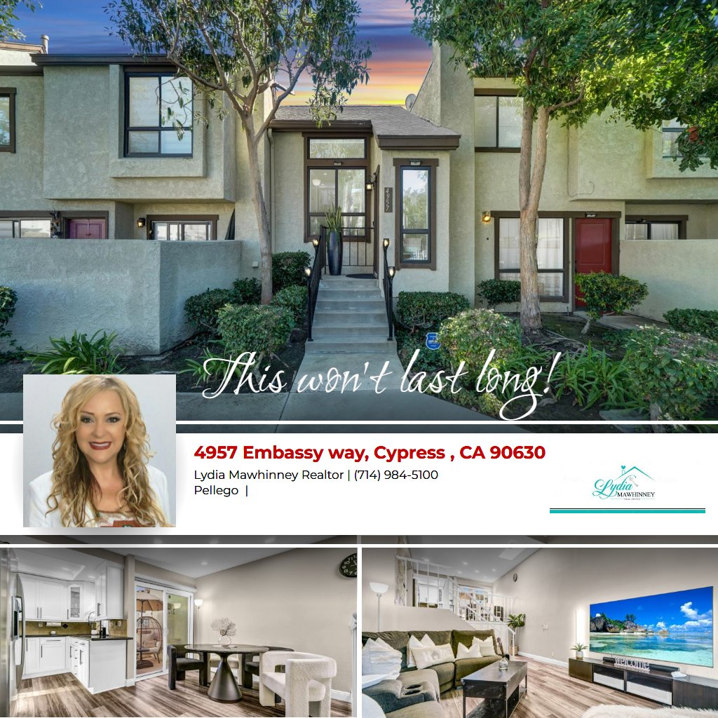 Step into this beautiful turn-key 2-bedroom, 2-bathroom townhome that perfectly blends comfort, style, and modern convenience. Nestled within the desirable Embassy Park gated community, this residence offers privacy and peace of mind, along with access to wonderful amenities including a sparkling pool, lush green spaces, and abundant guest parking. Inside, you’ll find a fully remodeled kitchen featuring sleek cabinetry, elegant countertops, recessed lighting, and high-end finishes—ideal for both daily living and entertaining. The bright and airy living room boasts vaulted ceilings, a cozy gas fireplace, and abundant natural light streaming through newer dual-pane windows with remote window coverings. Step out to your private deck patio, perfect for morning coffee or evening relaxation. Both bathrooms have been thoughtfully remodeled with modern fixtures and finishes, including a beautiful en-suite bathroom in the primary bedroom. Throughout the home, enjoy new waterproof vinyl flooring, motion-sensor lighting, newer paint, and a contemporary feel. Additional highlights include a separate interior laundry area, an attached two-car garage for convenience, an EV port, and extra storage with a new Lift Master safety lock door. Located in a desirable neighborhood with excellent nearby schools, this home truly has it all—modern updates, community amenities, and a welcoming atmosphere. It is just minutes away from Disneyland and Knott’s Berry Farm and centrally located to commute to Los Angeles and Orange County with access to 405, 605, and 91 freeways. This home places you at the heart of it all; come check it out to find out why it’s so desirable. Come experience the comfort, charm, and easy living this exceptional townhome has to offer! Call Lydia Mawhinney at 714-984-5100 to schedule your showing appointment!